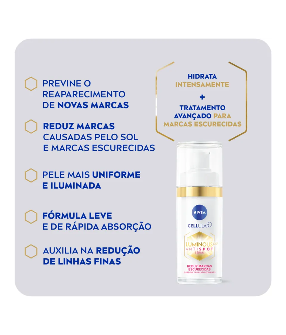 • CONTEÚDO: 1 frasco de NIVEA Cellular LUMINOUS 630 Anti-Spot Serum. 1 x 30 ml