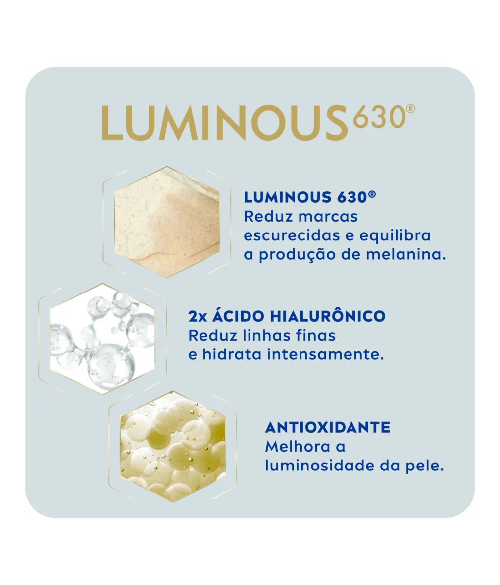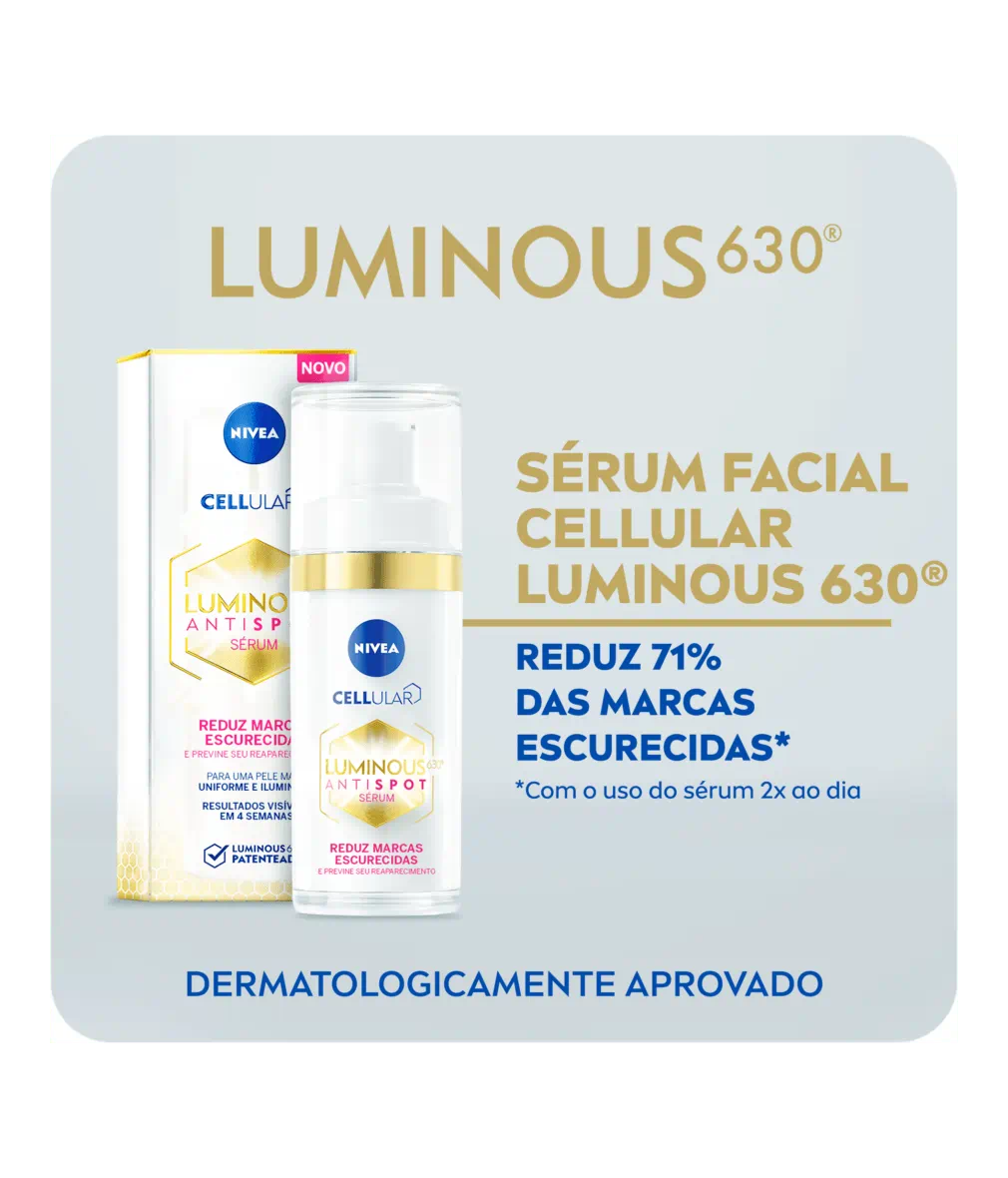 • LUMINOUS 630 PATENTEADO: 10 ANOS de pesquisa meticulosa para os cientistas da NIVEA encontrarem o altamente eficaz Luminous 630 em nossa fórmula de sérum facial