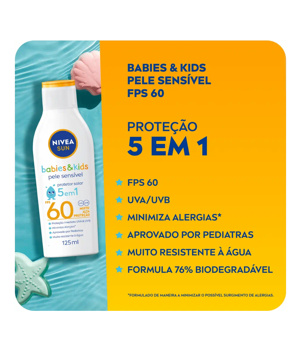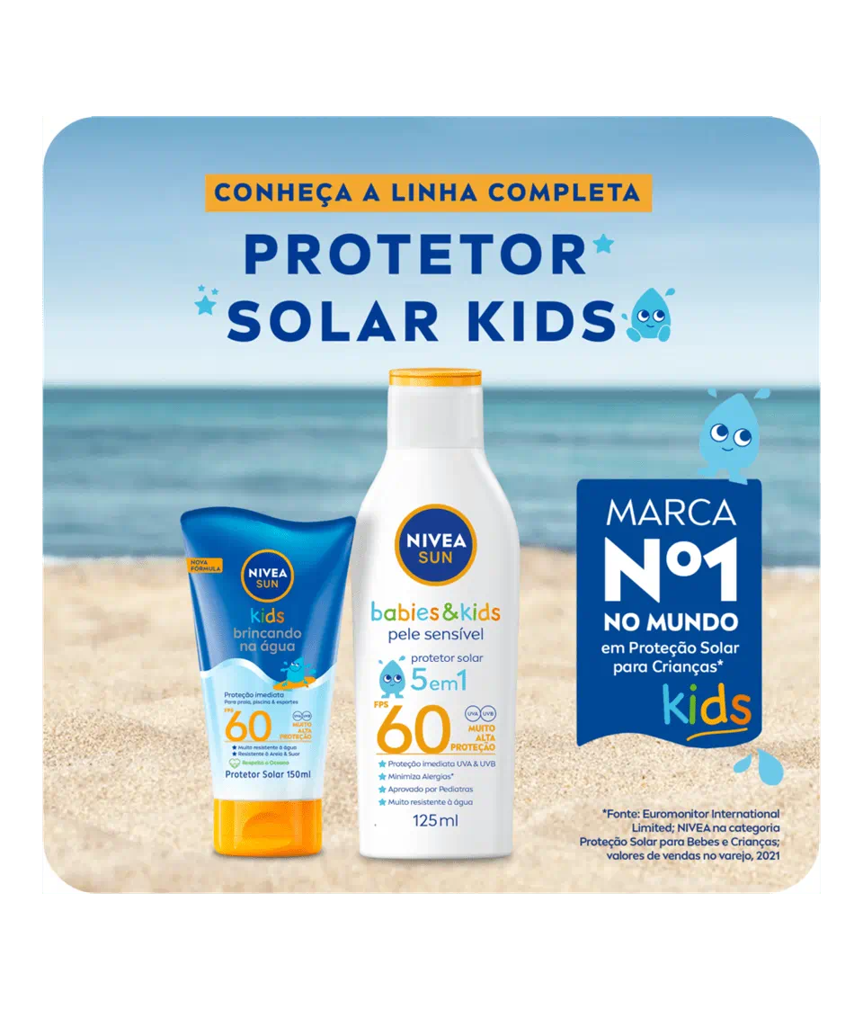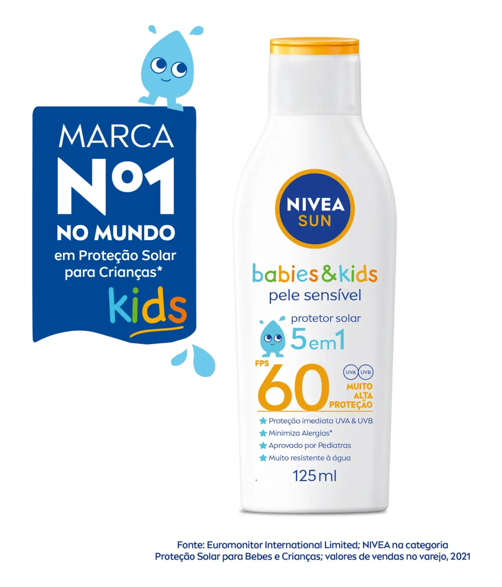 NIVEA SUN Protetor Solar Kids & Babies Pele Sensível FPS 60 é um protetor solar especialmente desenvolvido para crianças e bebês a partir de 6 meses.